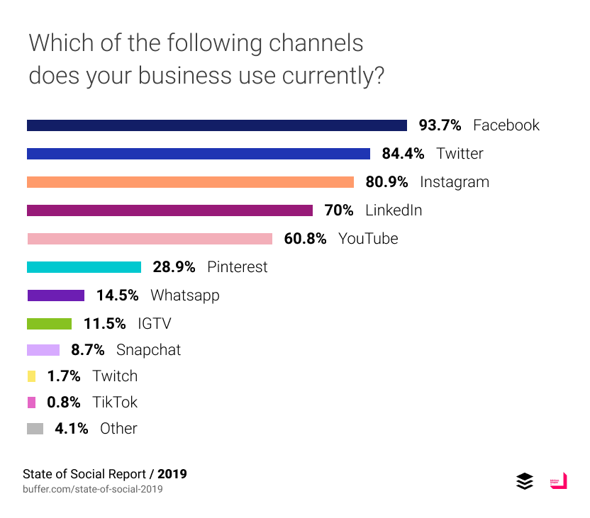 I undersökningen från Buffer ser det ut så här kring vilka kanaler som är populärast att använda just nu. Instagram fortsätter växa och lär sannolikt öka ännu mer med länkmöjligheter och shoppingtaggar i Stories.