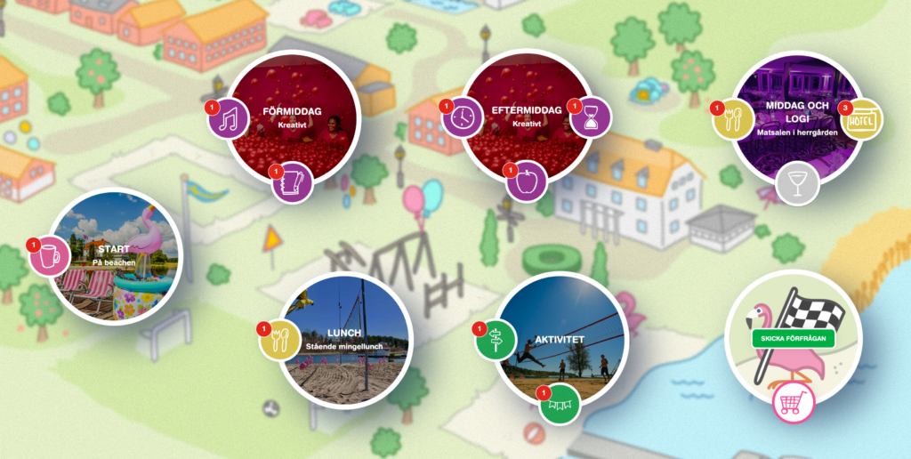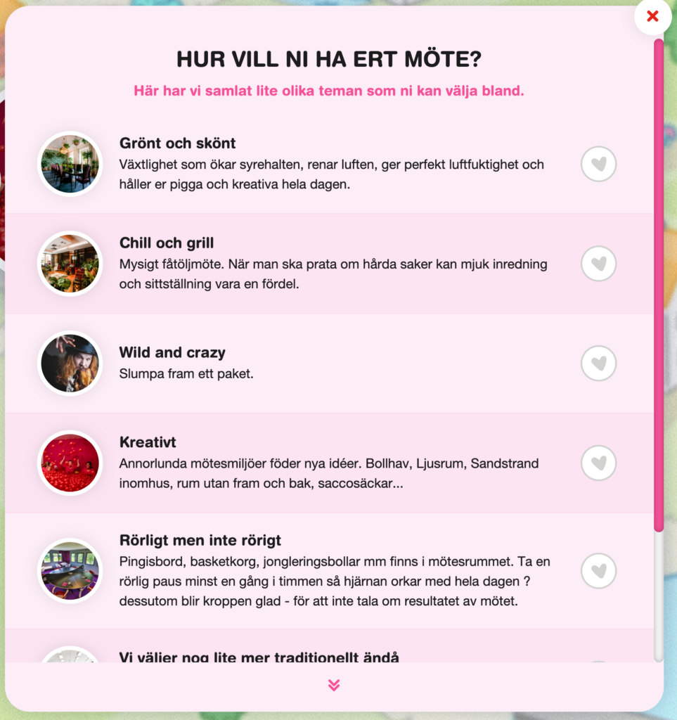Möte a la carte är en lekfull, webbaserad plattform som bjuder total frihet att bygga upp ditt nästa framgångsrika möte. Inspireras, dirigeras eller gör det själv. Hej då traditionell helpension – hej till frihet, lekfullhet och roligare möten!