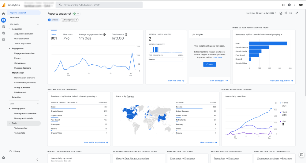 Den är byggd för att spåra och att du ska få en bra översikt, samt förståelse för hur kunderna interagerar med ditt företag i hela användarresan. Du kan enkelt se hur du får in besökare, hur besökarna konverterar, hur du behåller dina besökare och vad som engagerar.