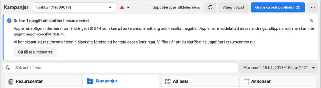 Facebook vill att vi gör två saker inför den här förändringen. I Resurscenter under Ads Manager står det exakt vad ni ska göra och helst att uppgifterna ska slutföras omgående.