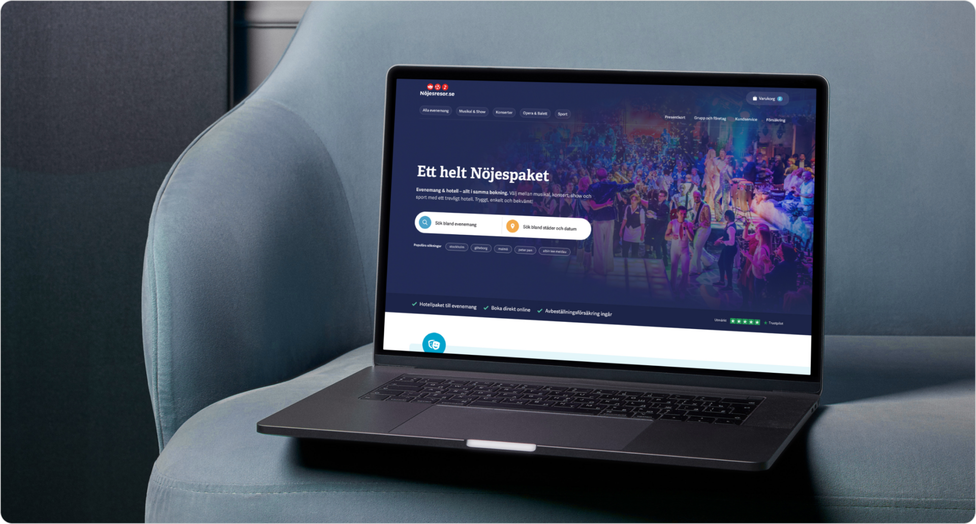 Efter att ha arbetat igenom köpflödet under hösten 2022, kände vi att stora delar av den profil som sattes 2019 kunde utmanas. Vi presenterade ett förslag för Nöjesresor som föll väl ut. Vi tog fram nya vyer för produktsidor, navigation, header, heroytor, footer, nya sökkomponenter med mera.